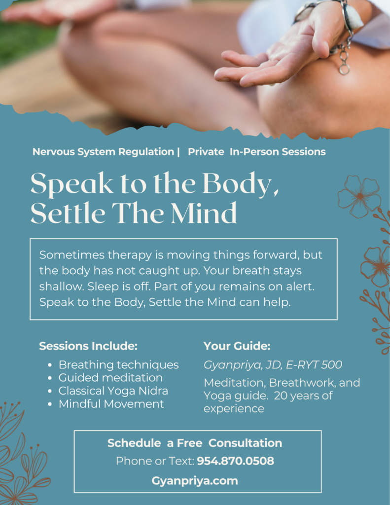 For nearly twenty years, I have designed programs in Meditation, Pranayama (breathwork), classical Yoga Nidra, and mindful movement, with stress, anxiety, and nervous system regulation at the center. Every program I offer is shaped around the person in front of me and refined over time through careful attention to your experience, your life, and what the practices reveal.
